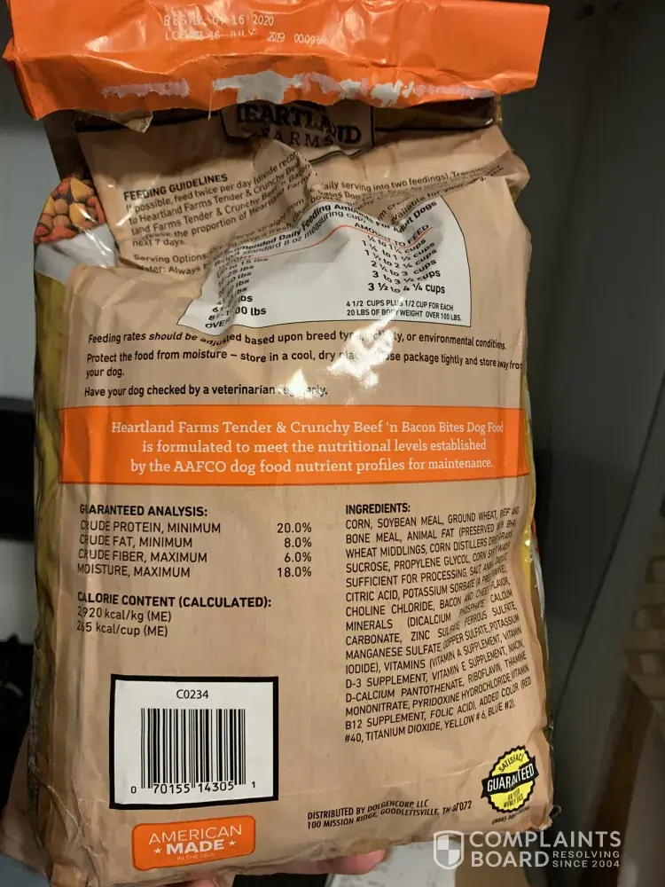 I stopped to get a bag of dog food and chose the heartland farms. When I got the dog food home I opened it. When I dumped the food into the bowl it was a giant ball of mildew. The bag was sealed, no tears or any openings. This was totally disgusting. After a long day at work this is the last thing I wanted to do was go back to store to get more dog food.