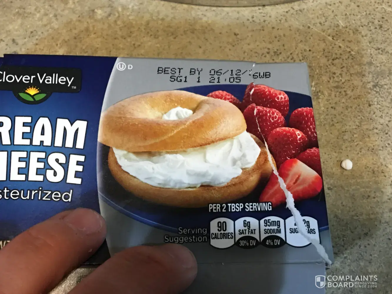 I purchased some Clover Valley cream cheese from DG because it costs so much everywhere else. My complaint is that I took a bite of the cream cheese and there was something "Plastic"/ "Chewy" in it. I have pictures of this. A small round piece of something that cannot be eaten. I am glad that my kids and family didn't get any of this.