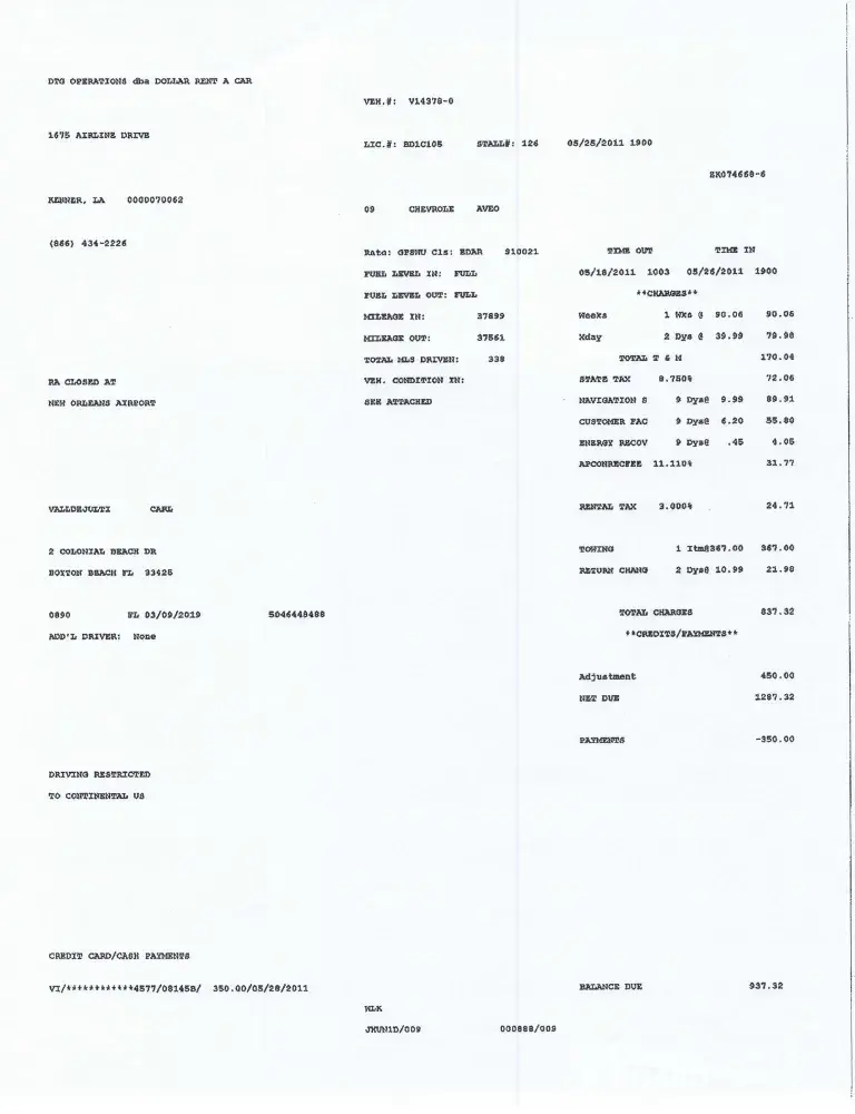 After a few days I spoke to Sherrie Lowery at Dollar again and we went over the bill. After all I have been through, she gave me a break as outline in the final settlement bill enclosed. I gave her a credit card and she charged a total of $350.00 leaving $0 balance.