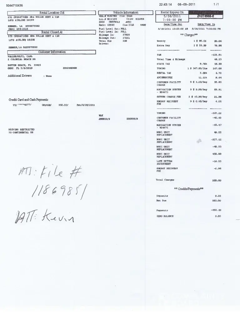 Much to my surprise a couple of weeks later I get a call from JNR collections demanding a payment of $937.32 with no backup documentation. I called and spoke to Sherrie at Dollar and she did not know anything about this. I forwarded the copy of the paid in full receipt from Dollar to JNR and they told me that it did not matter and that corporate adjusted the bill. I then asked them to at least have the courtesy of forwarding an itemized copy of the presumed charges. It took JNR a few months to do this, meanwhile the harassing letters and threatening phone calls continued. Finally on Aug 26 I received a copy of the new charges. Needless to say, I was appalled. The charges were exactly those that Sherrie and I had discussed and that she had adjusted in the final invoice. One of the charges was a rental fee for a GPS along with a replacement fee for the same. This is not only ludicrous, but also reprehensible. I also find the cost of the NUVI replacement at $450 very questionable for I own two NUVI GPS and that unit does not even cost that at retail prices which I am sure Dollar does not pay to Garmin. This is morally and ethically wrong. Since I am not an attorney I cannot question the legality, but I suspect that this practice of gouging may also be illegal.
