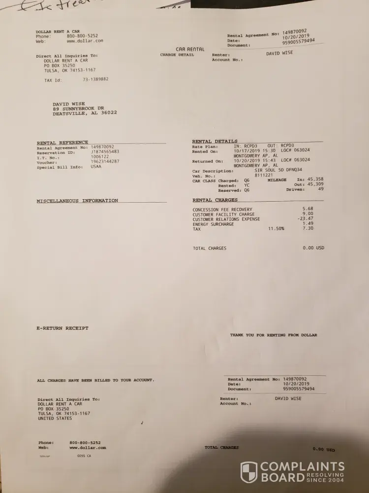 Dollar Rent A Car rental agreement 161069952 reservation j1884601334 11-2-2019 return 11-9-2019