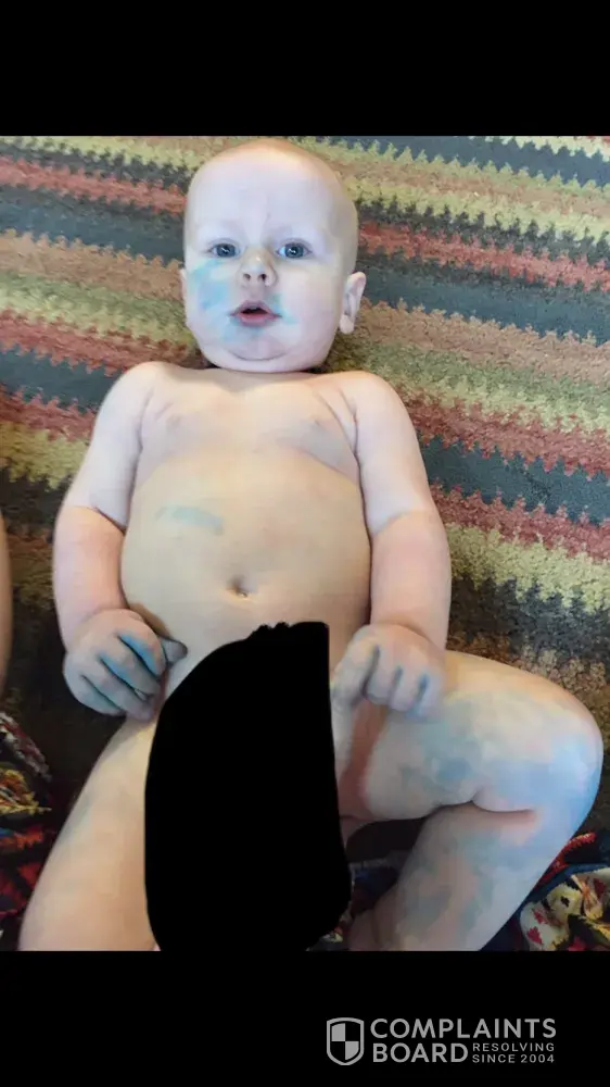 I purchased finger paint today and did my sons foot prints and handprints and let him paint. He had the paint on him for 2 minutes max and then I gave him a bath and within the two minutes of him touching it, his skin is completely stained.. I've used different soaps, makeup remover and it won't come off. My son is BLUE! I got it on my skin and it's stained me too.