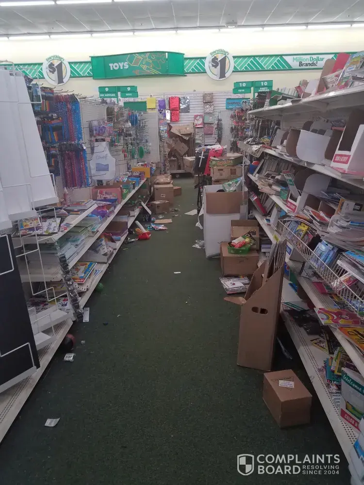 This was an awful experience and I feel very bad for those employees working there. Dollar Tree needs to hire staff full time and allow plenty of additional hours to keep the store safe, clean and maintained all the time. What kind of company allows their employees to work in an environment like that? Have they no respect for their customers as well? The higher-ups in the Dollar Tree chain should be mortified and ashamed of how they allow their company to operate a business. Remember the customers choose where they want to shop and without them, there wouldn't be a company. Your employees working lower on the ladder deserve a nice place to work. Please fix it.