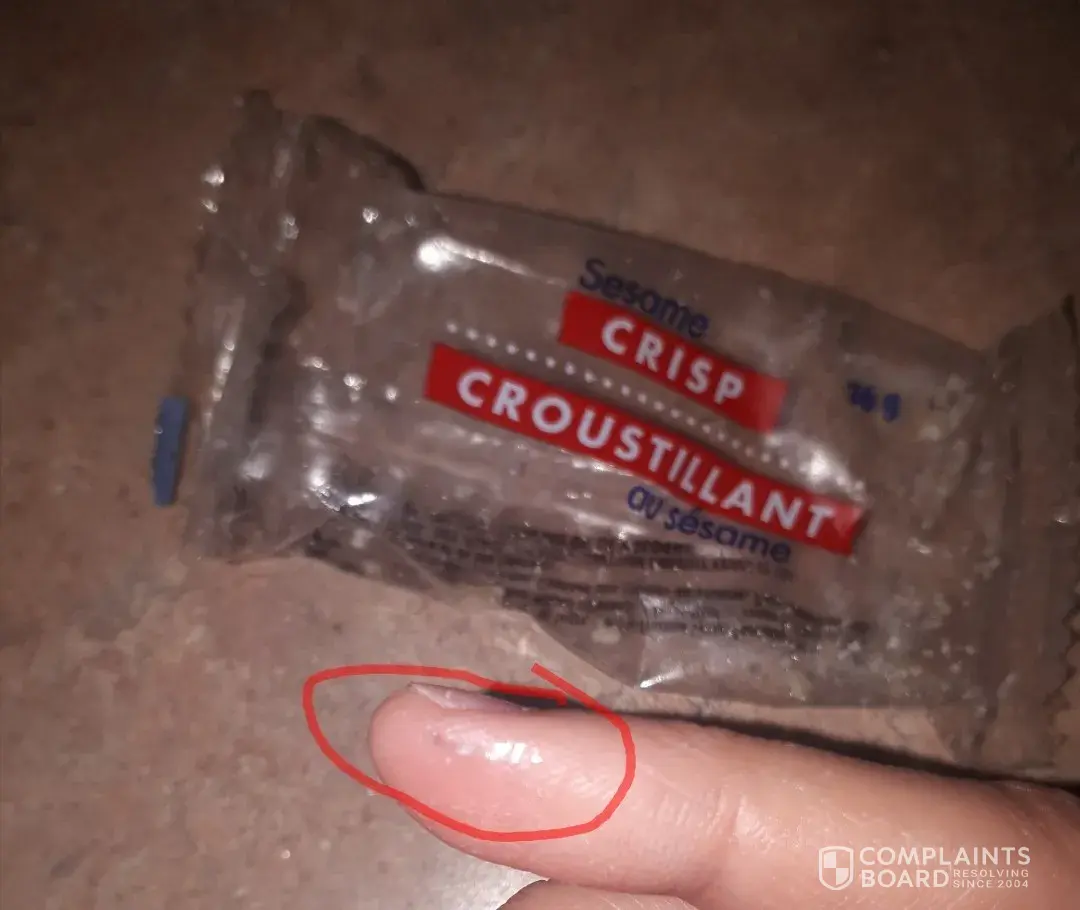 Purchased a snack under the name "Sesame Crisp", and as I bit down into it I realized there was a part I couldn't chew. It turned out to be a small piece of plastic, the size of a small fingernail, that hard been right in the middle of it.This is beyond ridiculous, it needs to he pulled off the shelves before it happens to anybody else, and causes an accident.