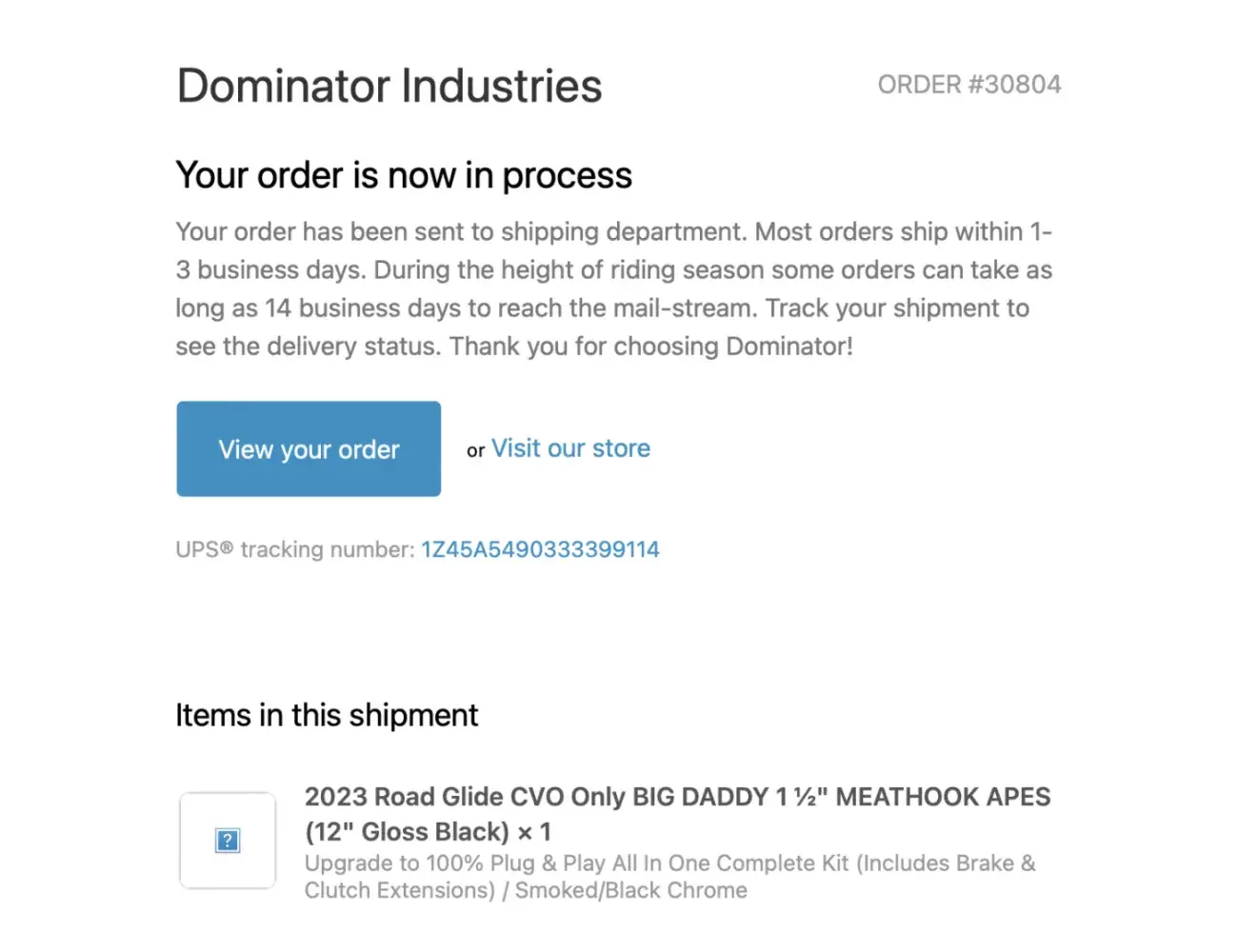 I work for a large motorcycle dealership. I placed two orders with Dominator Industries, the first on 4/19/22. Their website stated a 114-day turnaround. Shortly after ordering, I received an email with tracking information. However, the tracking status indicates that the carrier has not yet picked up the product. My attempts to get a response from Dominator Industries regarding these orders have been mostly unsuccessful. The Shop Network app on my phone showed an expected delivery date of 4/22/22 for my first order. I emailed a screenshot of this to their help desk on 4/28/22 and have yet to receive a reply. Both orders were paid for by my company and are to be shipped to our business address. After seeing numerous complaints and a decline in their rating on Complaintsboard.com, I regret choosing Dominator Industries. My customers are waiting for these products, and I need to know when they will arrive and if they will be as advertised. Once I receive the orders, I intend to avoid Dominator Industries in the future and will inform the National Dealer Network of my experience.