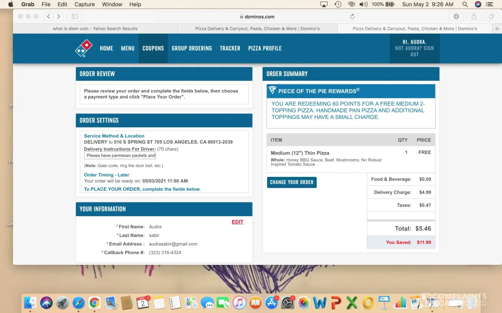 On today, May 2, 2021, I reached out to Dominoes at [protected] at 9:25am/pst. I spoke to a girl who answered, after holding online for almost five minutes, and explained to her that every time I try and use my rewards for a "Free Pizza" when I go to submit the offer, it returns an error message each and every time. I have tried this offer for several...