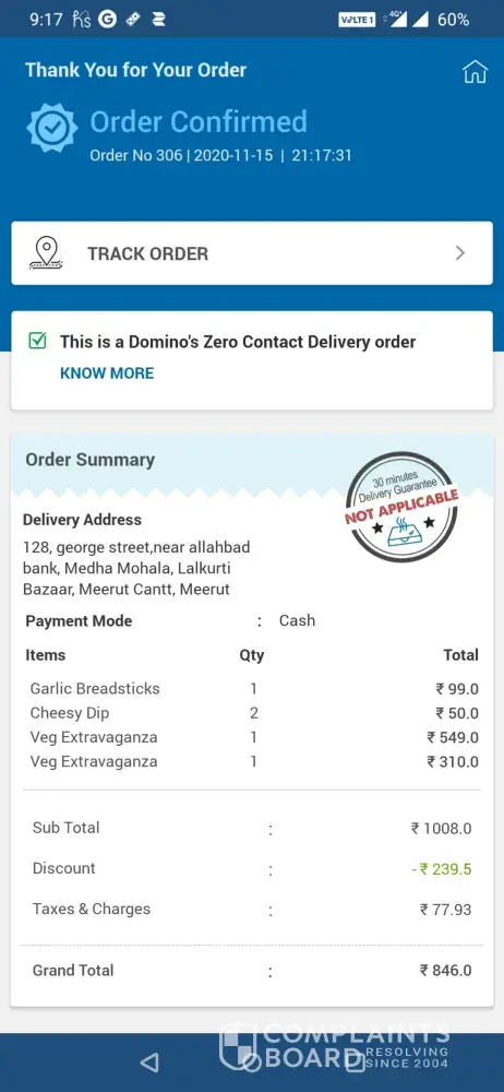 We are highly disappointed with Domino's order received today (refer screenshot for details).
