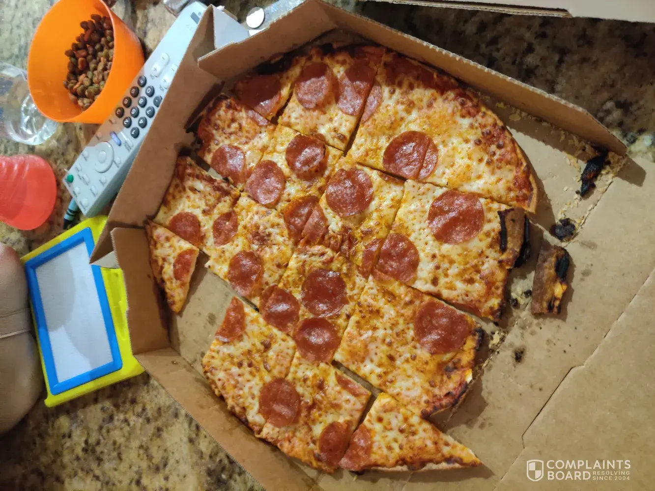 I called Dominoes at approximately 2:30 p.m. for delivery of a large pizza. The cost was (I think) $15.78. I followed up with a second call at 3:30 p.m. After 15 minutes on hold, I hung up and called back. The person who answered said it would be about 5 minutes more. It was actually delivered at 4 p.m. It was cold and burned black around the edges. There...