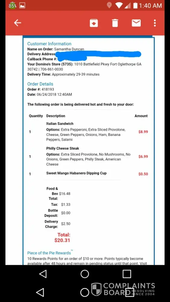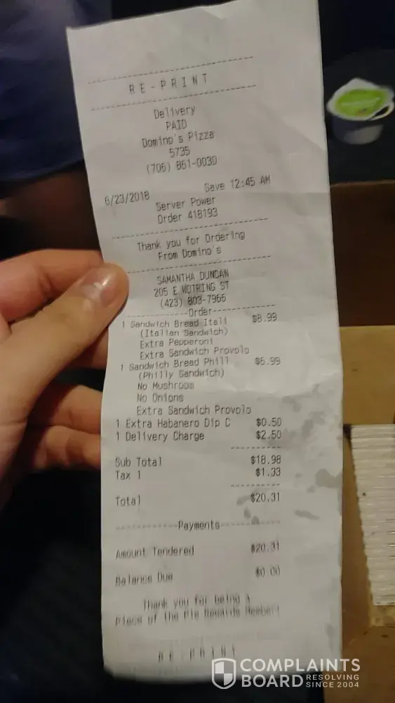 Yesterday I made a complain regarding not being satisfied with the pizza & more over my order was changed by Dominos without my permission . Neither my complaint was entertained neither I was been compensated.I am disappointed by the behavior I found my money wasted.I think Dominos will hear my Complaint and will compensate me for the waste of my money.