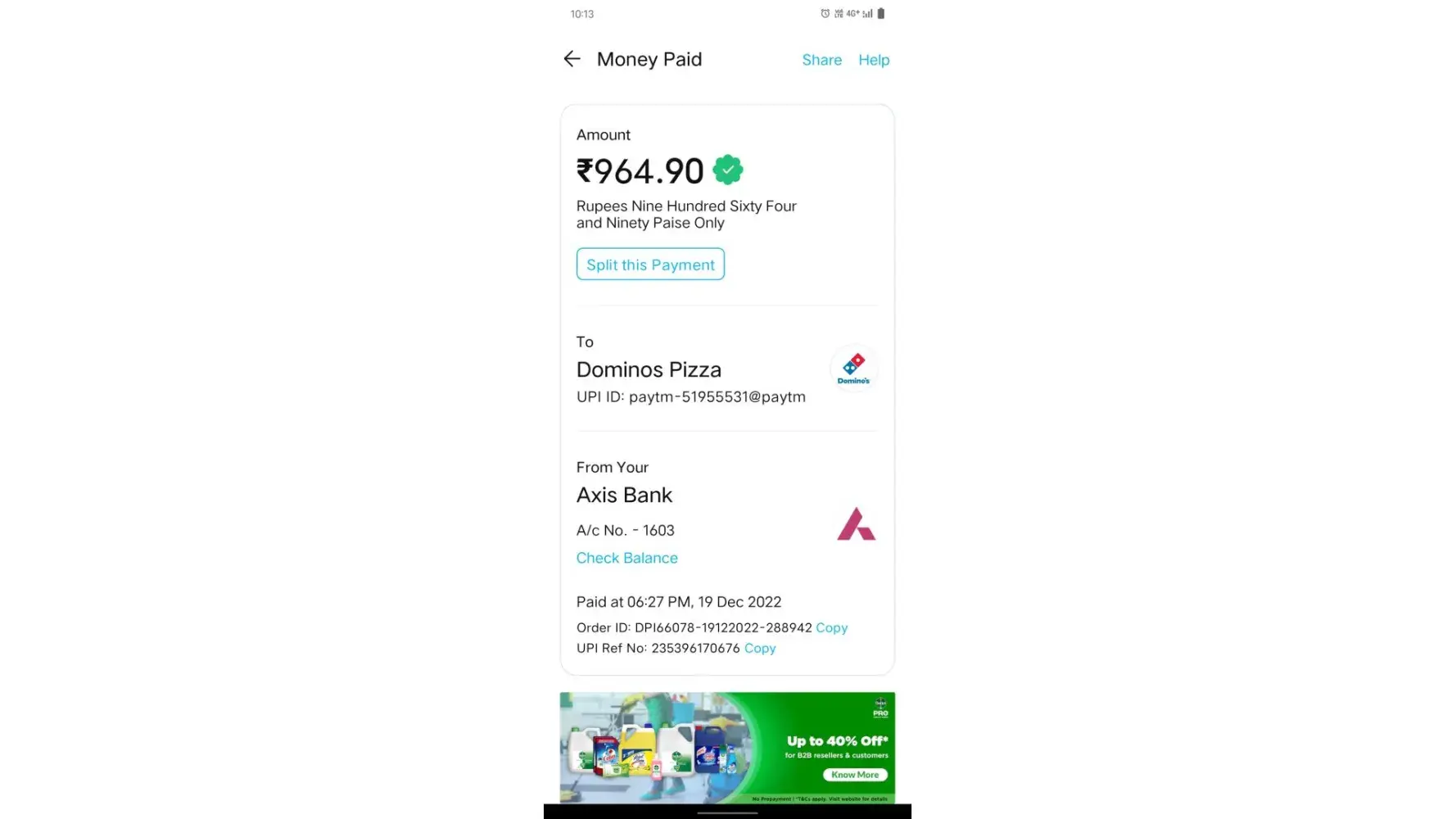 Mall kota rajasthan India, I ordered two medium size pizzas and the bill amount was of 964.9 rupees and I paid it successfully through the Payment link below (https://paytm.me/C-6vX1r) then the attendent said he didn't received the payment confirmation and sent another link (https://paytm.me/n1H-ZVg) he asked me to pay it again on which I was angry and asked to talk to his senior, the senior of his came and said who will pay for the pizza you have ordered because we didn't received the money you paid . I was devastated and my whole appetite was lost somewhere. Still I ordered through the Domino's Pizza application. But I didn't received the refund so please help me on this .