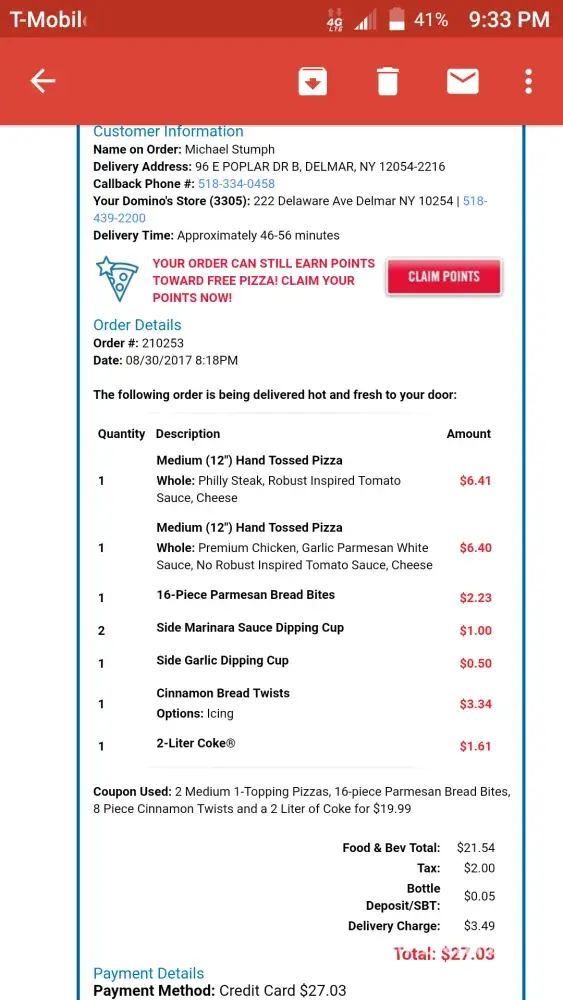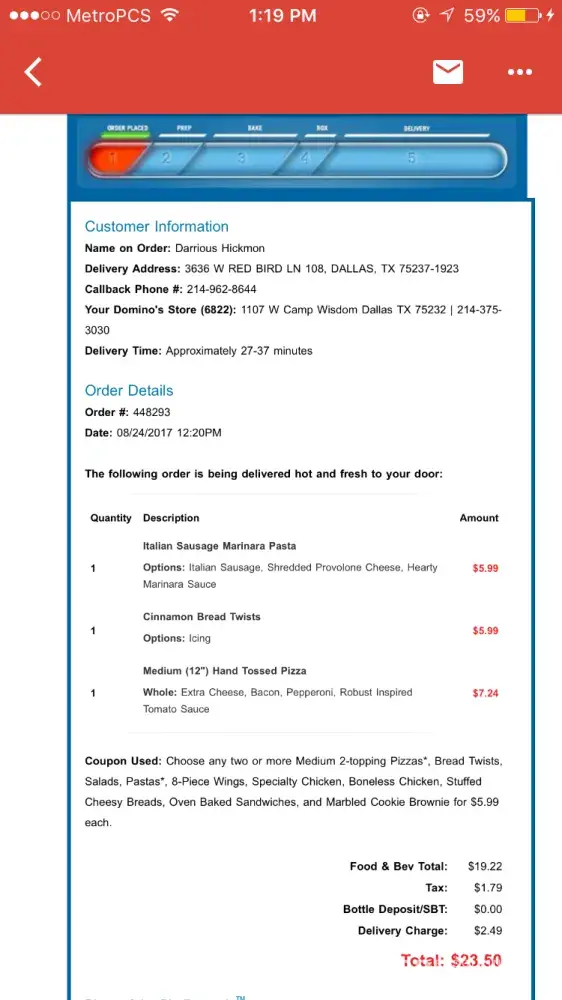 The pizza also didn't taste fresh at all. It tastes like it'd been sitting there for awhile. Dominoes has always been a favorite of mine but I'm not sure I want to have them deliver anymore. In highly disappointed with my last few orders.
