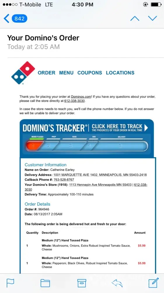 I ordered a pizza from local Domino's, Charlotte, NC.