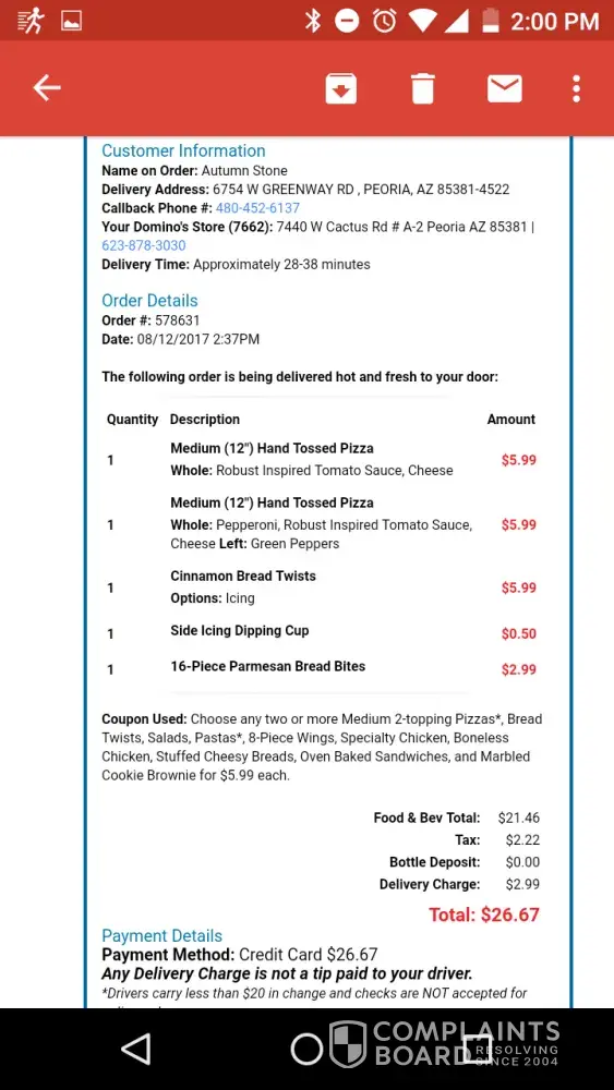 I placed a order for dilivery today 8/13/2017 I got a coupon from the website 2 medium 1 topping 16 pice parmesan and cinimon twist and a 2 letter for 19.99