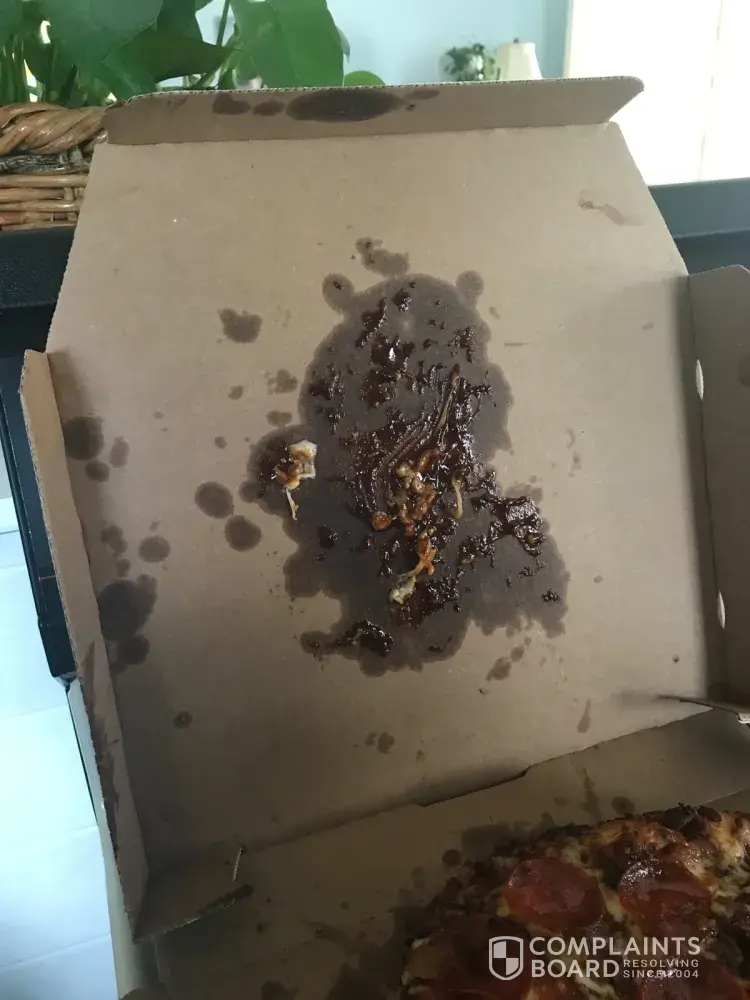 However the bbq pizza was smashed against the edge of the box and lid, not cut evenly or all the way through. It had an enormous amout of bbq sauce, a bunch of unmelted cheese, i thought it was chicken which i dont eat, it was luke warm and tasted awful.