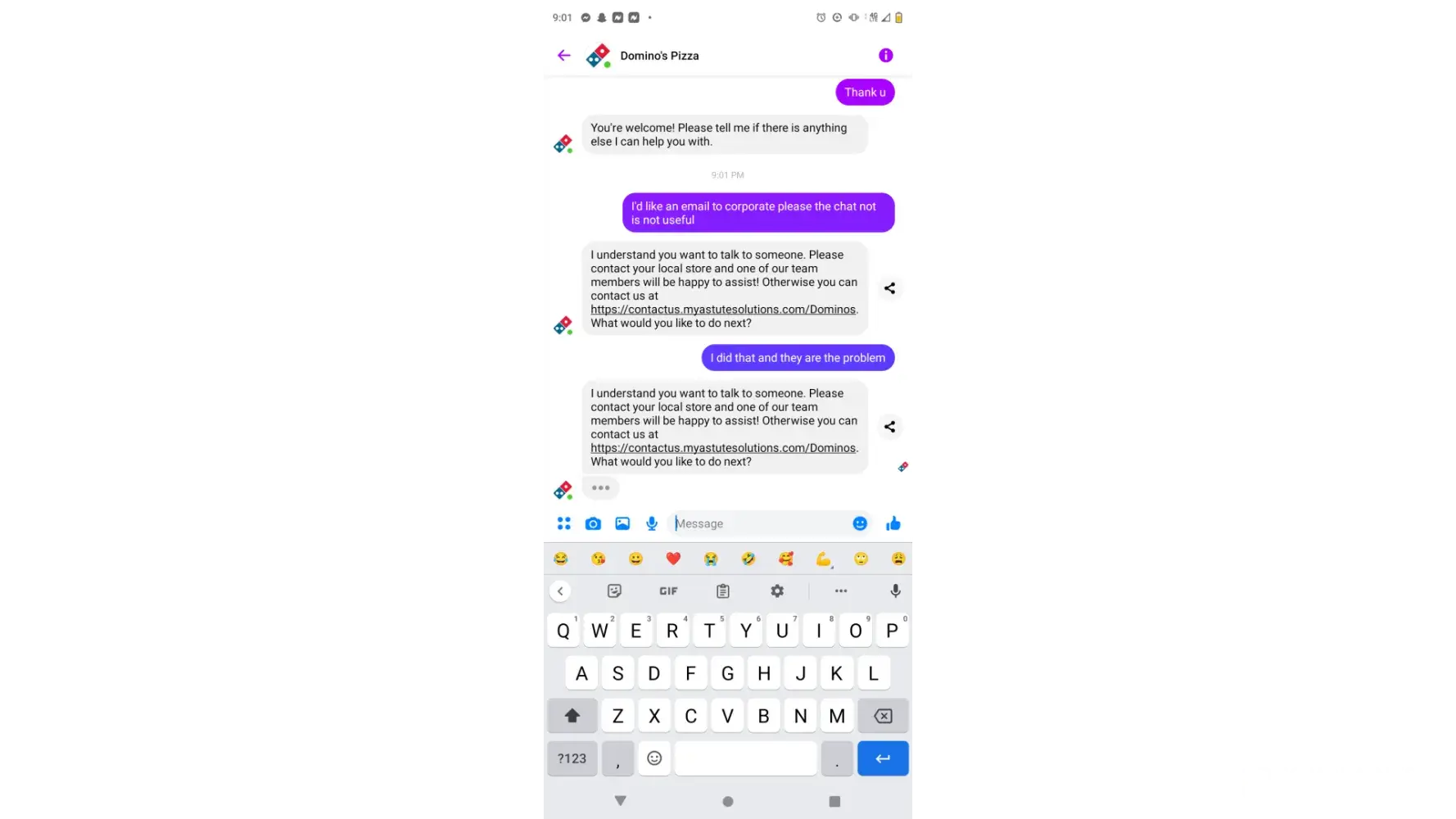 I don't know why I would ever buy another Dominos after such an exhausting and tedious experience, but the guy at the actual physical Domino's location prepared the food faster than this person took my order! And he made it right for me too.