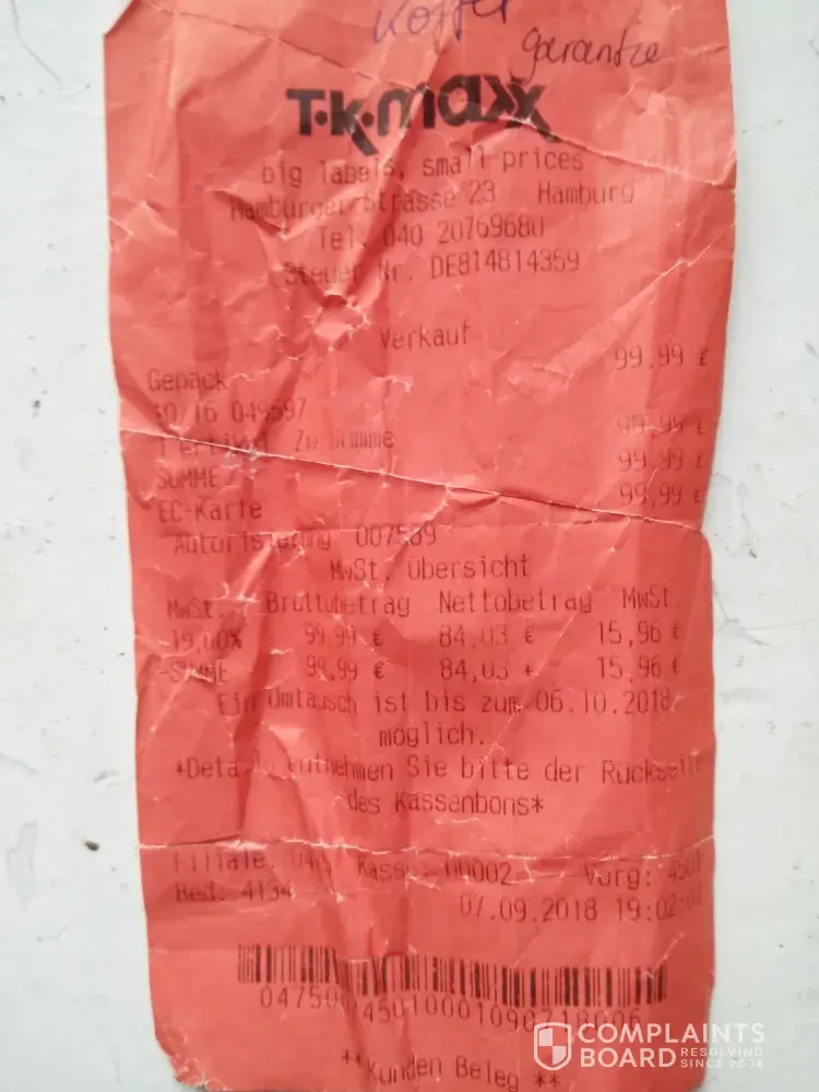 I purchased a beautiful DKNY suitcase in Sep. 2018 at TK Maxx in Hamburg, Germany, for the price of EUR 99, 99.