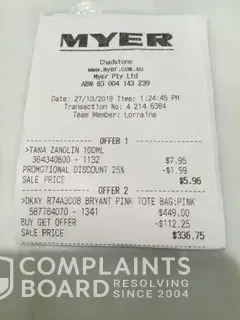 I asked a repairer about it, and they said it would cost nearly as much as the bag to fix. I then took it back to MYER, where I purchased it, on the 26/10/19. I have the original receipt which shows that I had bought it not quite a year ago, on the 27/10/18. The shop assistant agreed that there was a fault and asked her manager about it. They said they could only offer me 40% discount on a new bag as this style was no longer stocked. I showed her the exact bag in a pinker colour, same code, but she insisted it was different.