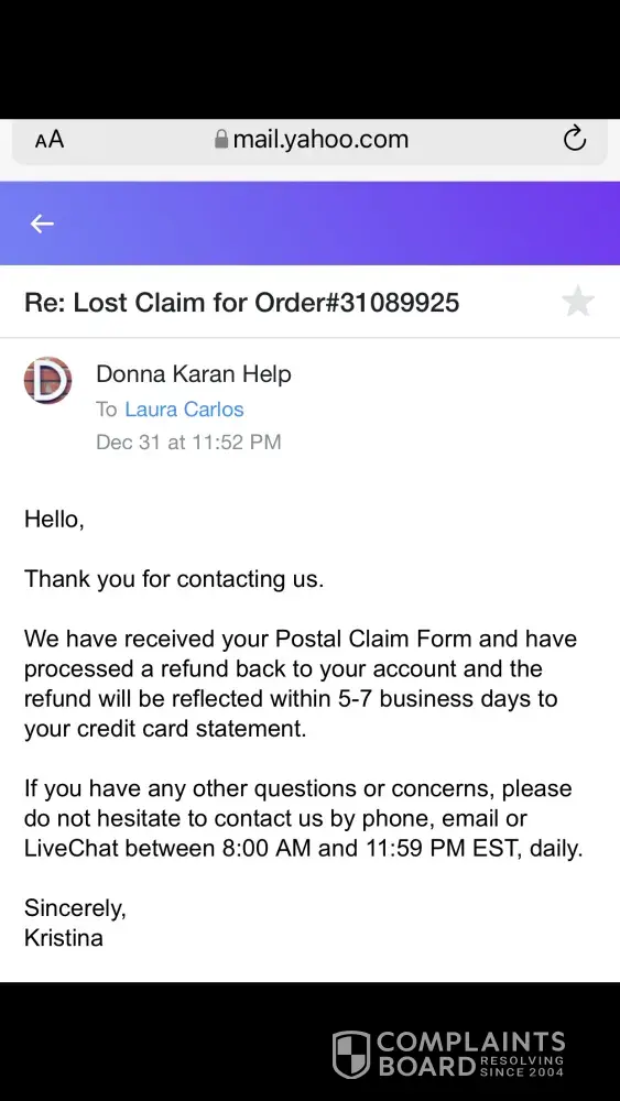 I placed an order online and I only received part of the order and so I contact DKNY for assistance and they sent me a form I have to filled out in order for them to refund me and that was 39!days ago and still haven't receive my refund. I've contacted them several times and they stated they don't have an answer and I am at a loss right now. I been cooperative and returned the form right away, yesterday they asked for the form to be filled out again and I sent it and still nothing.
