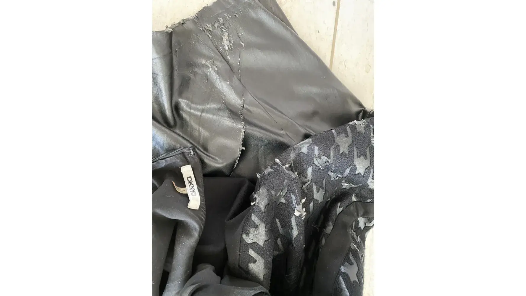 I bought a DKNY skirt, a pair of pants and a dress with fake leather parts and also a wallet. All fake leather parts dissolved in time so that I had to throw all of them away. I thought you were a high quality brand. It is pretty disappointing to have such a poor quality after I paid so much money. Your merchandises are not worth the price tag! I wore my DKNY dress in Mikla, an upscale restaurant in Istanbul during my vacation. It was all fine when I wore it but by the end of the night, it was in pieces as seen in the pic. You made me embarrassed.