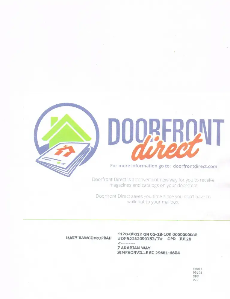 As many other wrote, I did not ask for this delivery system and it is horrible. For the past three months, my Oprah magazine is thrown on the grass underneath mailboxes that are not even for my address. The sprinklers go off and each of my magazines were too wet to read. Your service is deplorable and I would never recommend your company to anyone. I would like to have my magazine delivered by the postal service and right to my mailbox, as Doorfront Direct cannot do what they say they will - deliver to my front door.