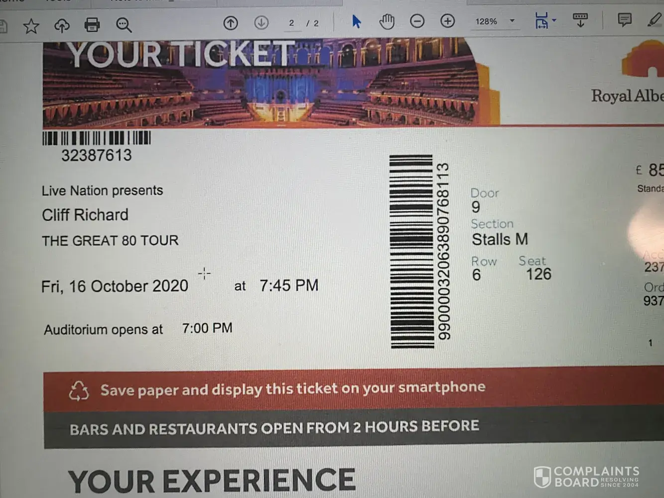 My ticket for the Sting concert at London Palladium booking reference [protected] Seat D3 WAS INVALID AND I WAS REFUSED ADMISSION.