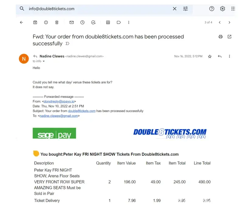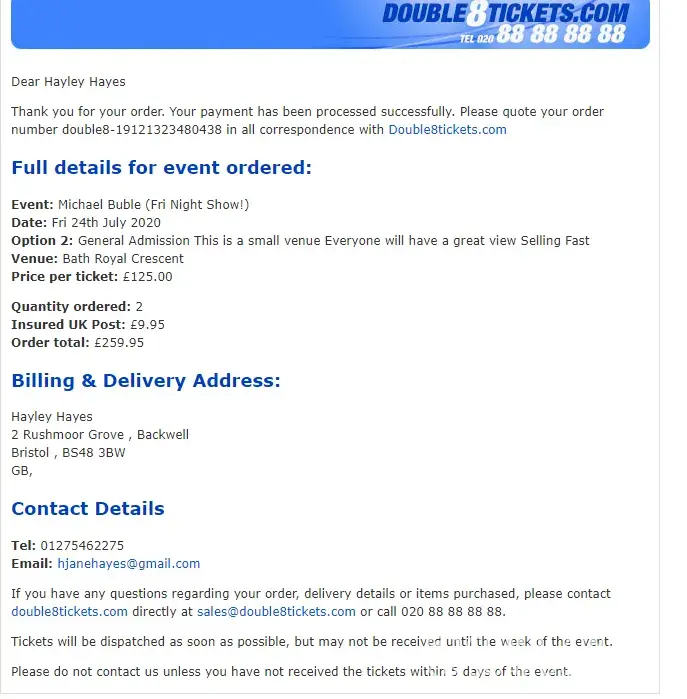 As you can see from my order confirmation when you look at the picture. I paid double8tickets £250 + £9.95 for Michael Buble tickets which have just been emailed to me showing a far less value set of 2 tickets valued at £140 plus 2x £9.95. They also have a different name on them not mine.