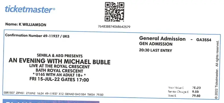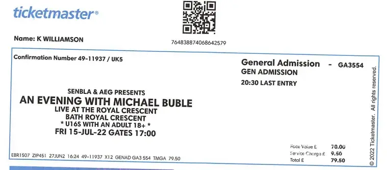 2 concert tickets to see Michael Buble at Bath's Royal Crescent on Friday 15th July bought from Double8Tickets.com