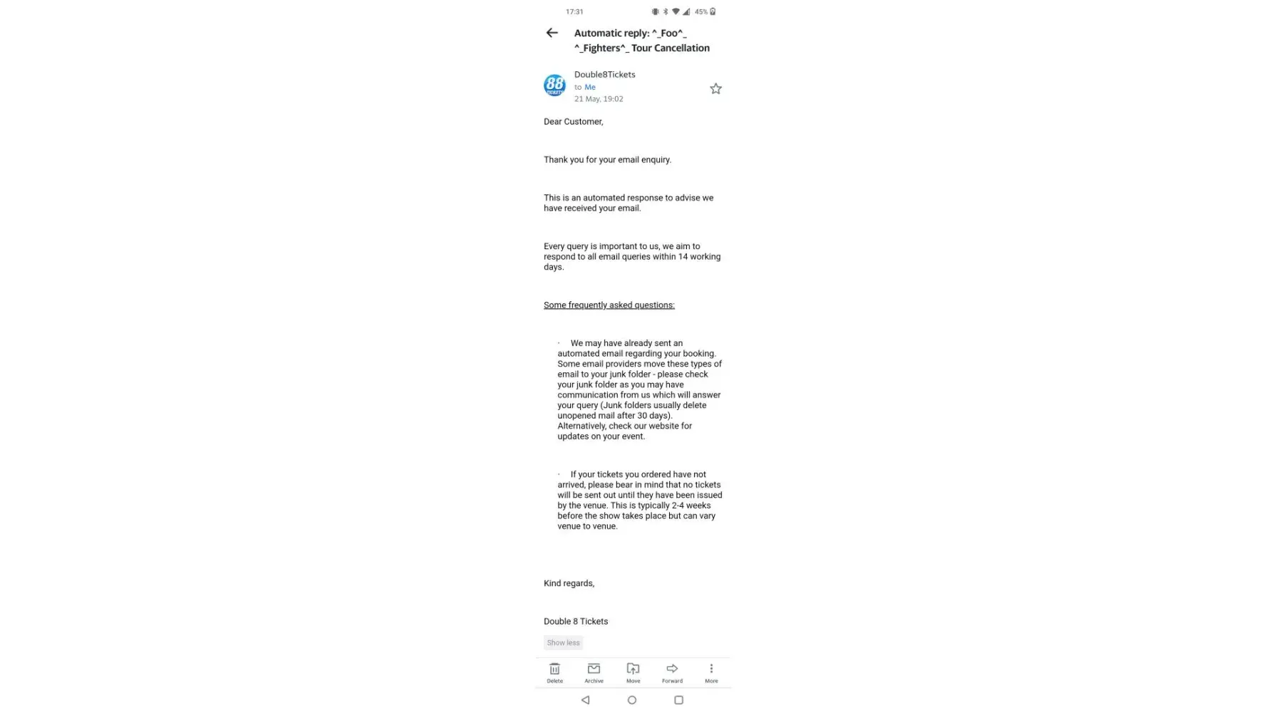 I bought tickets for Ozzy Osbourne UK tour in Sept 2018. The tour was postponed and rescheduled several times and eventually cancelled by the artist. Having paid £290 for 2 tickets, I tried to contact Double 8 at the beginning of February 2023 to get a refund. Double 8 will no longer respond to emails or phone calls, despite me trying to get a response for the last two weeks. I am not sure how I can resolve this matter, as Double 8 have shut up shop, if you want to contact them by phone or email.