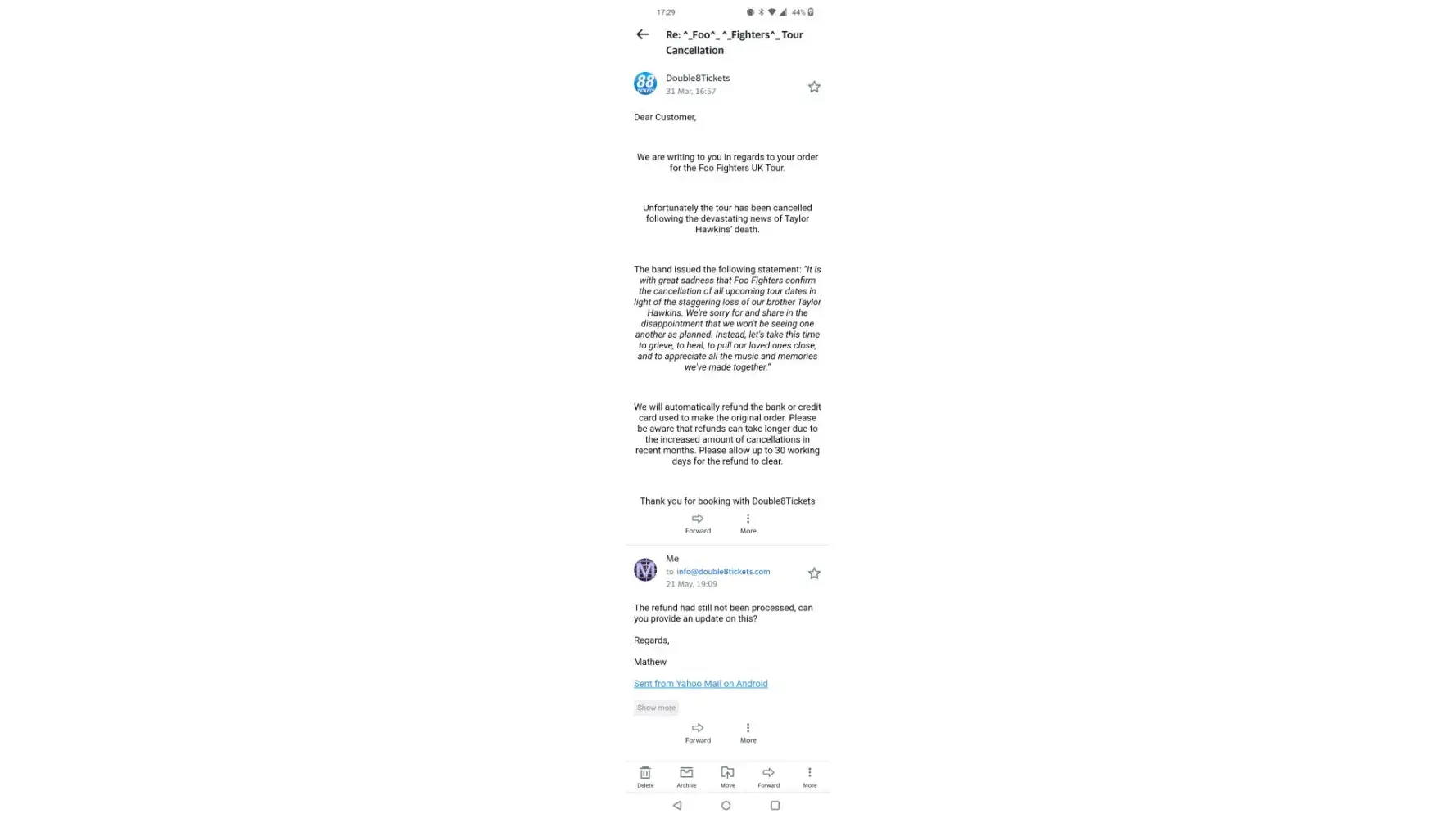 Booked and paid £629.95 for Foo Fighters tickets on 21st August 2021, obviously the sad news of Taylor Hawkins resulted in the cancellation of the event. I received an email from double 8 tickets to say the event was cancelled on the 31st March and that I'd be refunded, they said to allow up to 30 days for the refund to be received. It's now been almost 4 months and nothing, I've emailed which they've simply ignored, I got the automated response which says they aim to respond within 14 which is utter rubbish as they've just ignore the email.