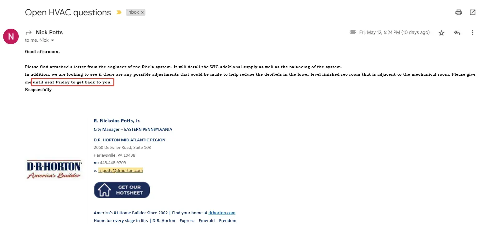 DRHorton NJ-PA unit is the most pathetic group to deal with. Their warranty process has zero guardrails. I have raised so many requests and they had never reached out until I followed up several times. A lot of issues I have reported remain pending from December 2022 and VPs of NJ/PA region have been trying to excuse of of it. DRHorton must fix the driveway, uneven tiles in both bathrooms, uneven flooring issues on the living floor, stairs and landing squeaks, uneven walls, and major of all - HVAC return noise, missing air vent (boot) in Bedroom - WIC, and temperature difference in all 3 floors which is almost 10 degree. They over-prices my house to find me as a bait and later lowered the price for all other buyers in the community. They must fix all issues with optimum quality of construction material and workmanship, or must refund $100,000 if the cannot. People should neve buy DRHorton homes. This builder is so shameless that they literally forced me to accept what I have got by asking their attorney to send a letter to harass me. All false claims for things under tolerance are on the attorney's notice and I have responded back with facts and pictures. HVAC plan submitted to county to get the approval was fake, when I complained, they revised the plan with county. Now the plan with county still doesn't match the actual in my home. DRHorton must be sued for malpractice and for playing with buyer's hard-earned money. DRHorton's whole top management was unable to answer even a single email I sent. They would commit to return back in timely manner but would never do so.