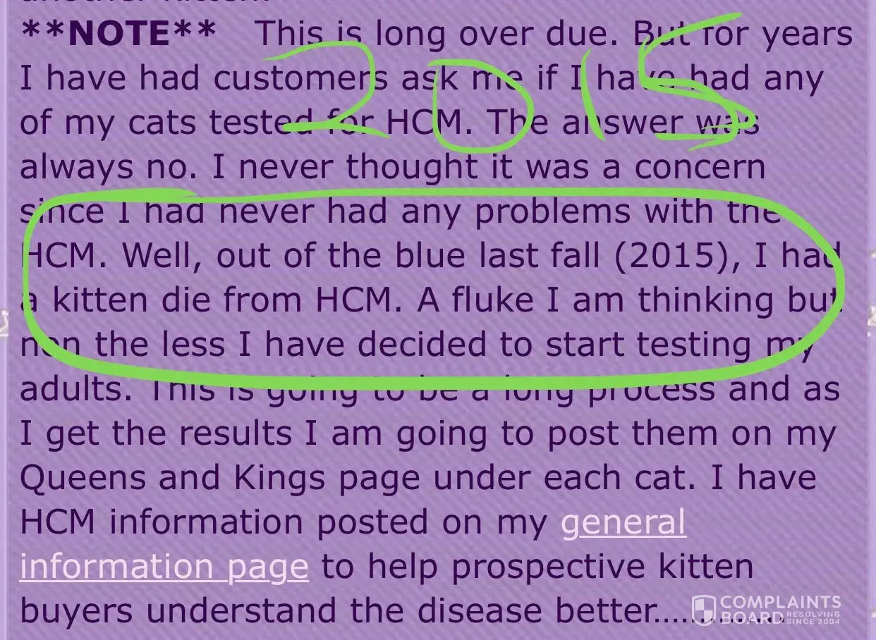 I am the breeder of the kitten that died. I am sorry for Selina Diehl . But this kitten buyer knows nothing about HCM. Both parents of this kitten that dies are HCM negative. The kitten died from something else but it was not HCM. The two cats that I did have that both carried the HCM gene on one side of their genetic make up were placed in pet homes and are no longer in my breeding program. Breeders have kittens die sometimes it's not uncommon. In this case I think it was probably Cocci. Which is a intestinal Parasite and not treated can cause death in small kittens. I have to admit I was having a hard time dealing with this litter of kittens as about three weeks ago my husband was diagnosed with lung cancer. My focus these last few weeks have been on him. He is not eating, he is vomiting, has dizzy spells, he has horrible headaches, and the anti-nausa medicines makes it all worse. He can not get around with out me. He has had to go into the hospital twice to get re-hydrated as he was not even able to hold down water let alone any kind of food. I'am a emotional wreck. My doctor thinks it may of spread to his brain. He had a CT scan yesterday 9-12-17 and is having a biopsy tomorrow 9-14-17. This women to file this petty complaint against me for a kitten dying, a kitten she hasn't even gotten yet is ridiculous. It is about the most horriable thing I think I have ever had happen to me. I explained to Sealna, what was going on with my husband in a e-mail, I refunded her deposit. I think she must be about the most un-caring and un-religious person on the face of this earth. I pray that she does not ever have to go thru a spouse dying in such a horriable manner. Anyone reeading this all I ask is that you say a prayer for Randy, he is a good man. He's only 58 years old. Here is my kitten buyers e-mail address: selina.denise@live.com