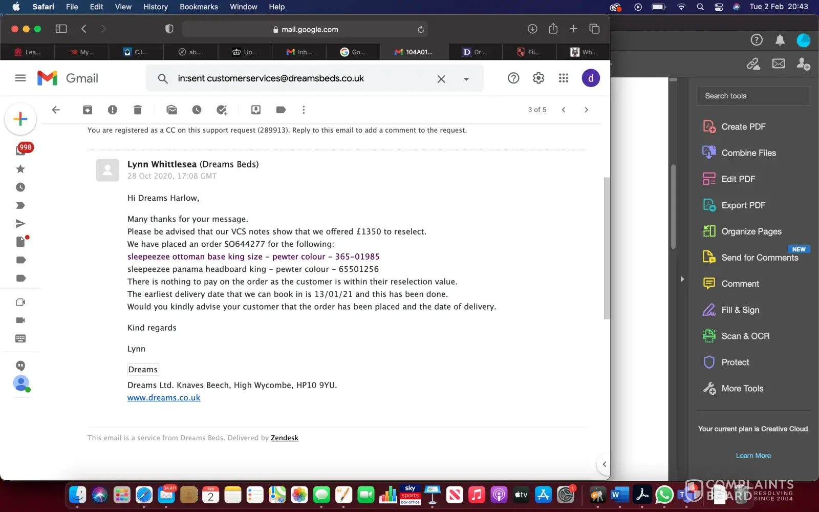 Please see below the email trail in regards to a faulty mattress within it's guarantee and the communications with the Dreams employee:-