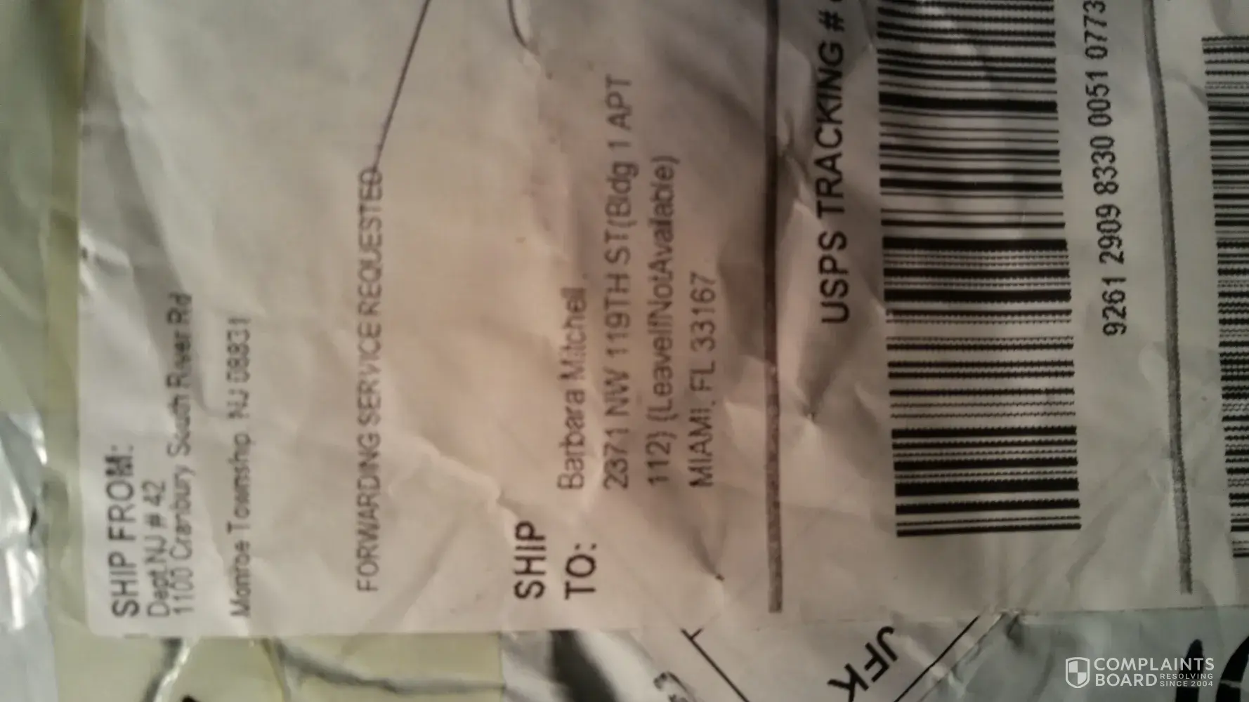 to your warehouse at: 1100 Cranbury South River Road, Dept #42, Monroe township, NJ 08831