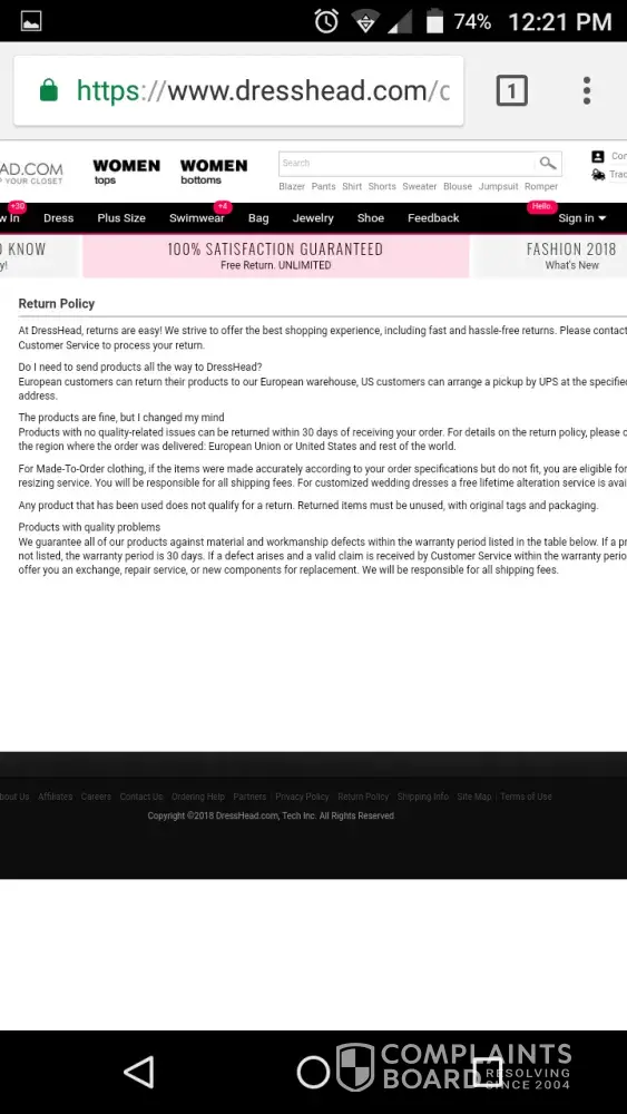 I received the 2 shirts I ordered from DressHead and found them to be of substandard quality - the material as well as the sewing and sizing.I immediately contacted DressHead customer service in accordance with the guidance provided on the Terms of Use page on their website.