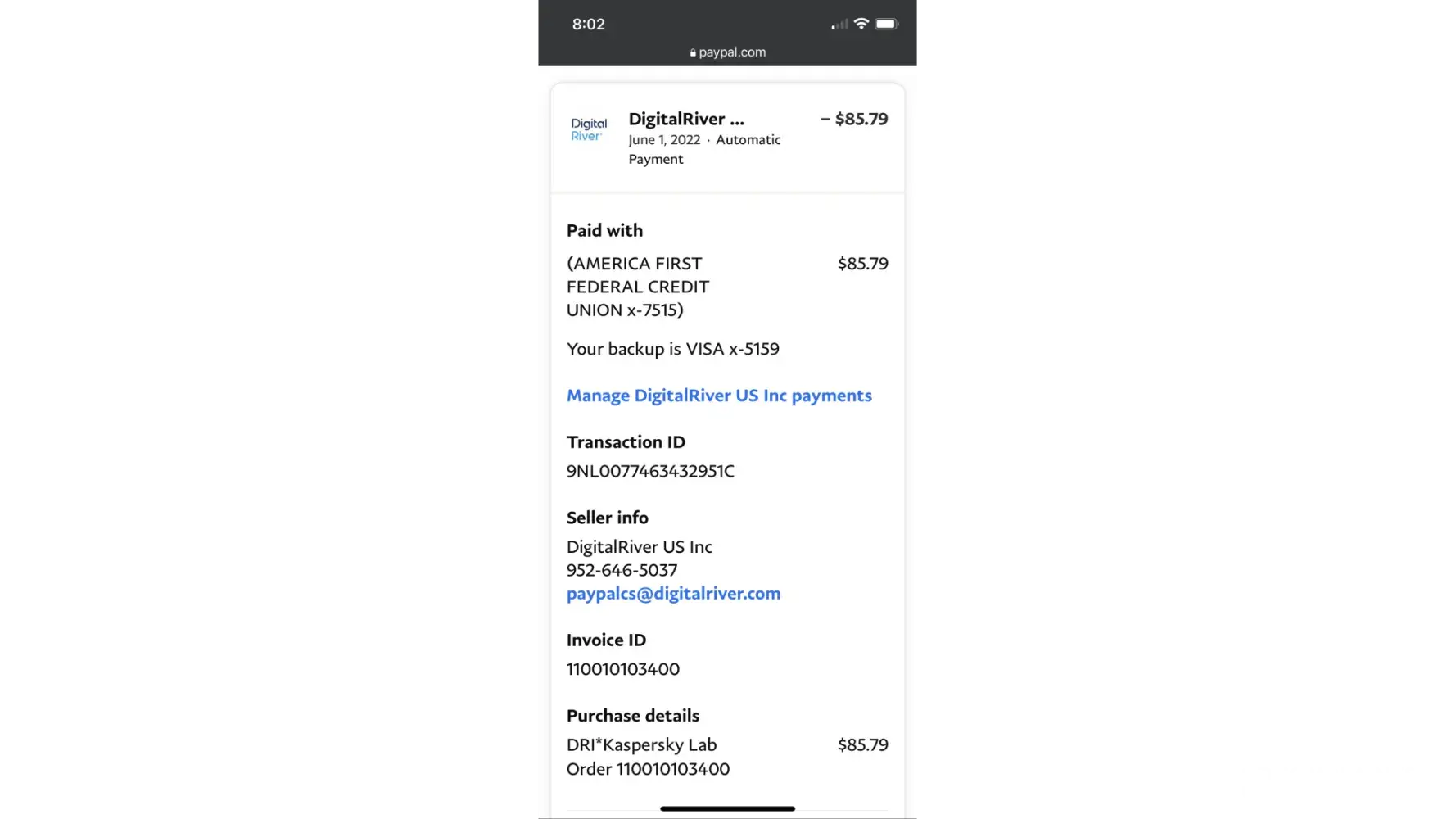 Was also charged $449.95 from DRI*Kaspersky Lab (Digital River, Inc.) via PayPal... fraudulent charge put through my credit card... made on August 15, 2009... actually has a shipping address to some person in Millington, NJ...would love to pursue a criminal case...