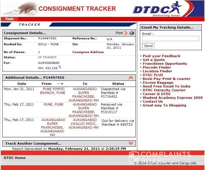 Shipment No. P14497450 booked on 31 Jan 2011 is not delivered till 21.02.2011. No positive response from Offices including corporate office.