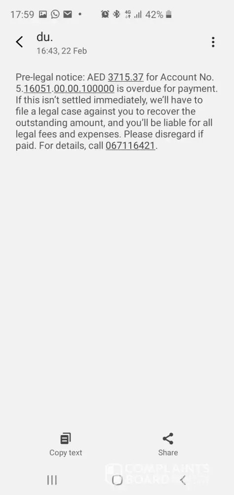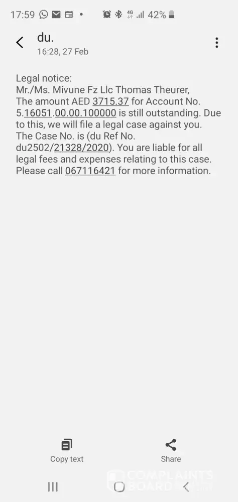 Hi. I have made numerous attempts to contact DU Customer care over the phone in February 2020 but am unable to get through. I keep receiving threatening text messages from DU asking me to settle a third party DU Bill. I had previously called up DU and reported this error in July 2019 and the constant threats stopped. Once again I have now received a threatening text message from DU stating that i have to pay AED 3700 plus legal expenses due to the account which is not mine and in the name of someone called Thomas Theurer of Mivune FZ LLC ACCOUNT NR 5.16051.00. This harassment is unnecessary and not ethical by a company such as DU. Extremely disappointing customer service. Not sure if this is a scam run by DU as it gives a number to call to settle claim. Very suspicious. About time DU look into company malpractice if this is happening.