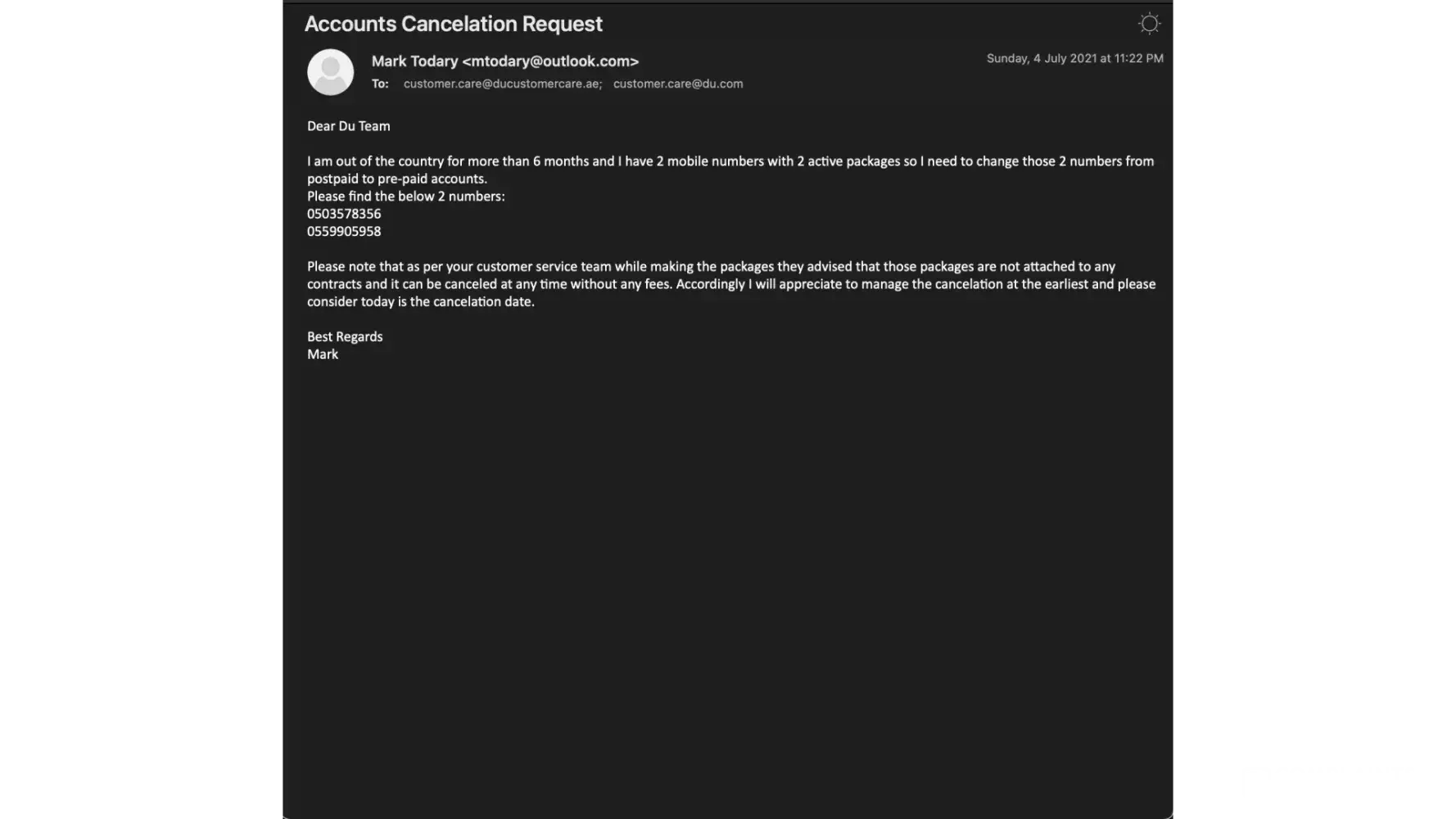 Once I travelled and I tried to cancel the plan over the phone they said you need to be in any branch to be able to cancel the plan otherwise send to Du customer service email to cancel it and I sent I think 2 emails with no reply from your side! And now you are asking me to pay a package for 2 lines for around 3 to 6 months which I didn’t use it!