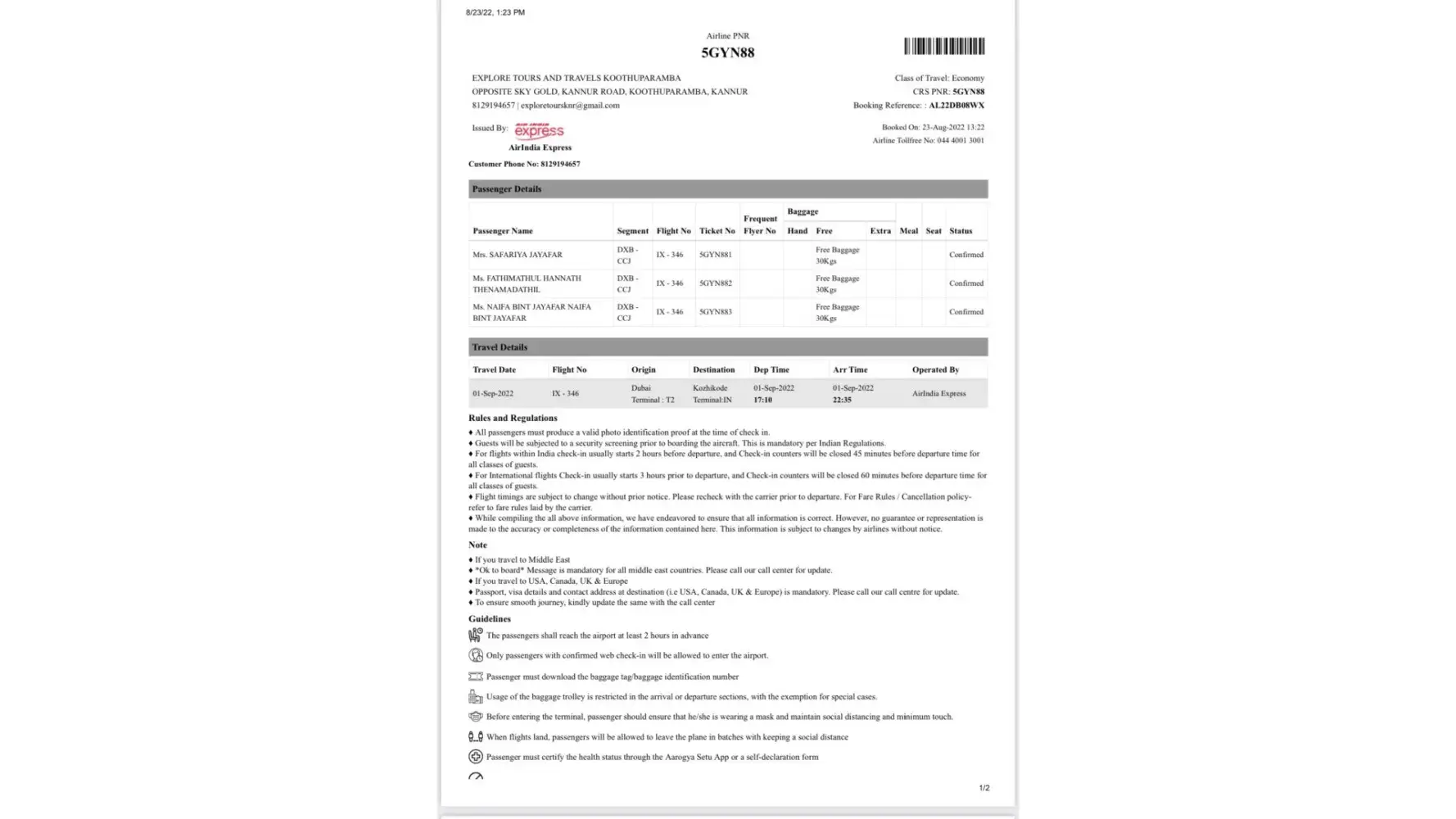 In the end wrong pnr Number was given please check E8KRRK, all pax 5 names were not updated in system of air india express, we had to go to Airlines and city office 3 times #55 token on 30 th afternoon 11 to 12 noon at diera city office with taxi expenses. 2 times to your airport office once on 29 th March 2023 and other on 31 st March 2023.