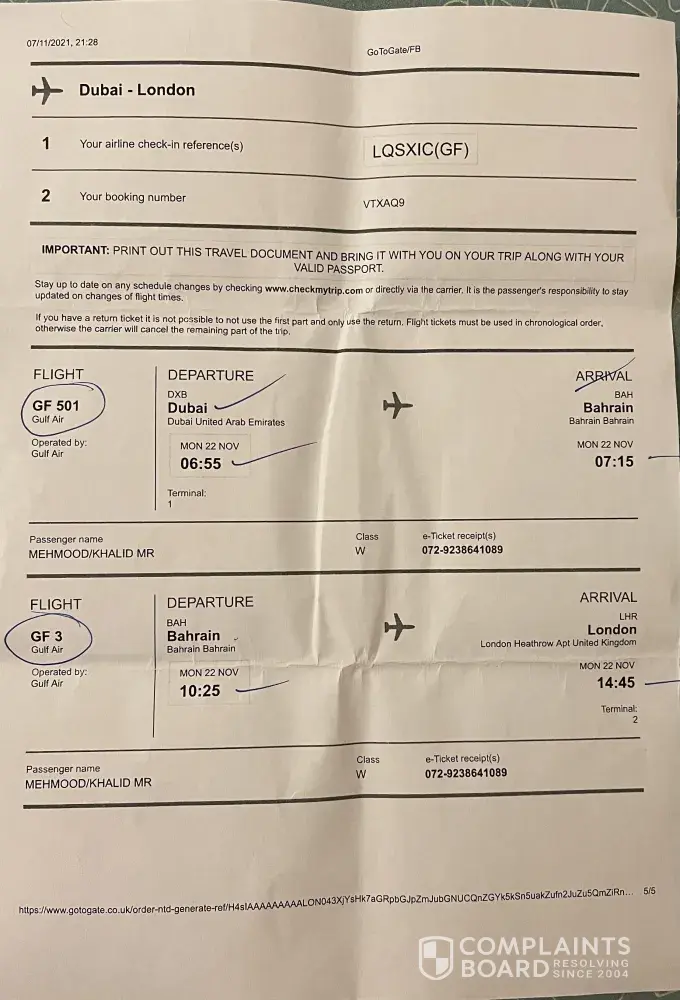 22 NOV 2021 reservation referring to the Gulf air passenger Mr. Mehmod Khalid and to the Gulf air ticket,