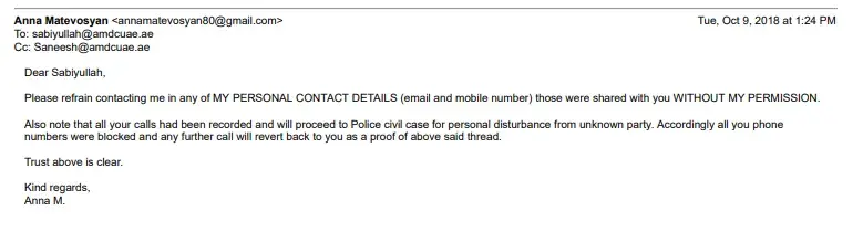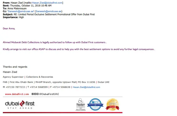 Please be informed that any further call from anyone presented from Dubai First or it's authorized 3rd party company will result in filing a police case for personal harassment with further legal actions against the person(s).