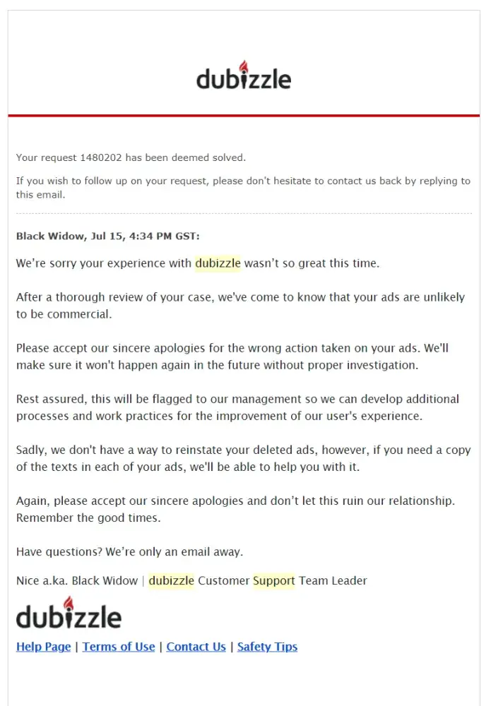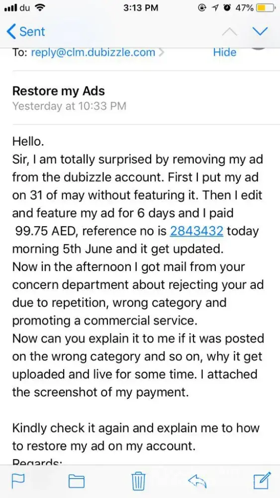 I paid dubizzle to featured my ad (same ad was there on dubizzle for almost 4 days before featuring), but when they featured my ad, within 4 hours they remove my ad and send me mail showing reasons which you can find in attached screen shot. I write mail twice on 5th/6th June 2018 for explanation but till now after 5 days passes haven't get any respond, which is truly disgusting. this behavior of you to me is not appreciated and highly condemnable. hope to hear from you soon.