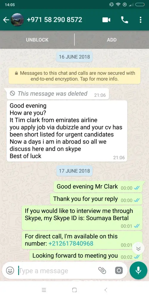 The person was sending me messages on WhatsApp and today I had an interview.