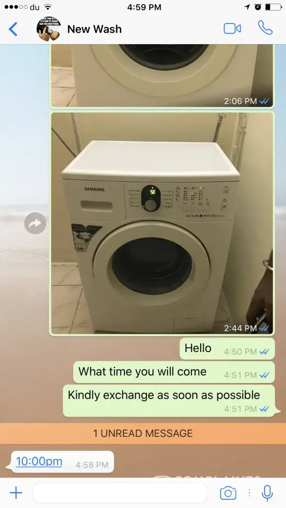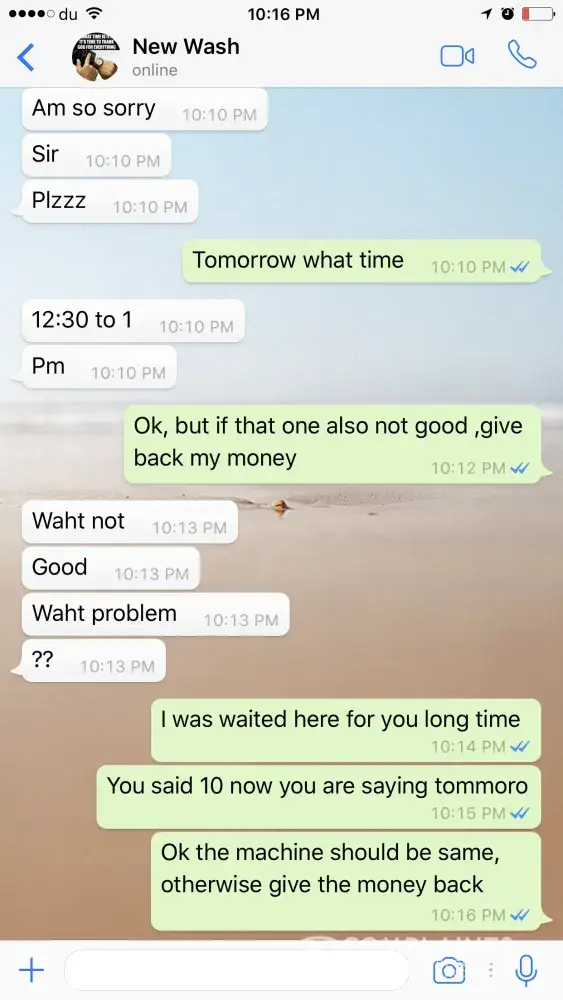 I have purchased used washing machine and fridge from dubizzle. The seller told me that it is good working condition and I booked these two items. After that he told me that if any complaints he will change the product. I got this items yesterday afternoon. But the delivery man said he doesn't have time for waiting while we check the product, so he told to give the money and he said you have the number so you can call if any problems you find. But the washing machines are not working we are tried to call the owner and the driver after the checking, the phones are not reachable and also no reply for the whatsapp messages.