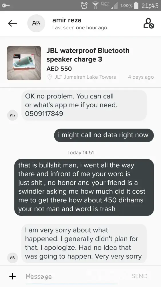 Seller was didn't go as agreed upon, went all the way to he's home when the deal struck and was agree upon. However change he's mind because he's friend said he will buy it. A [censor] seller and word is trash. I was there and ready to take exchange payment when he's [censor] ask friend stop the deal and say he want it and ask me to wait before taking the item. Then he call the seller and say he wants to take it the damn stupid [censor] as friend tell me to sorry and say he will pay for my transpo. I swear if this wasn't Dubai I would have beat the hell out of then and be happy about it [censor] seller and website.