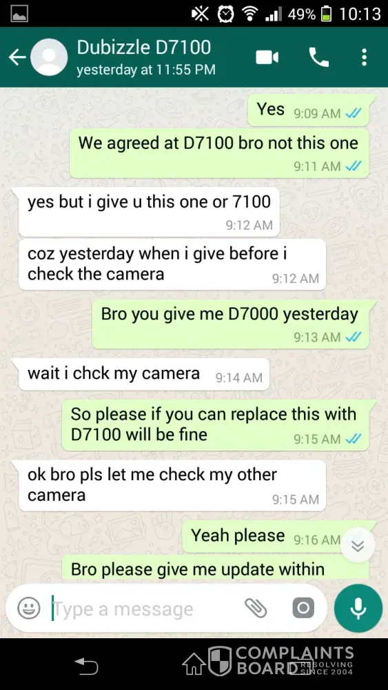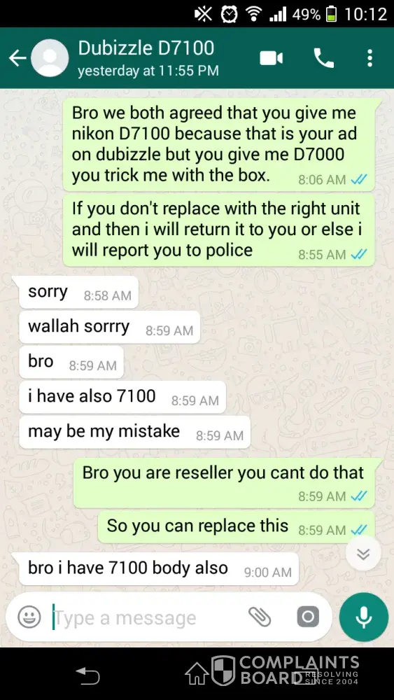 Last february 12, 2018 I made a deal to buy nikon d7100 model to this seller ([protected]), so we meet up around 7pm at palm deira metro station to complete our deal. But the following day I notice that it is different unit as we agreed by the seller. He trick me with the original box of nikon d7100 but he give me wrong model nikon d7000 which is not our deal is, I send him message and picture of unit telling that he give me the wrong model and he said maybe he made mistake because he has also another camera body, so I told him to replace the unit or return my money because this is not deal we agreed.