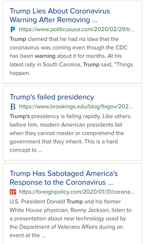 I am concerned about being tracked, true. But I am more concerned with outright bias and being propagandized. I asked a simple question about president Trump's quote quote in 2016 about the u.S. Being unprepared for a pandemic. What I got were 10 links, ten in a row, to absolutely horrifically negative articles condemning trump for his administrations dealing with this corona virus. Not one was even remotely related to my question. Three sterling examples are pictured below.
