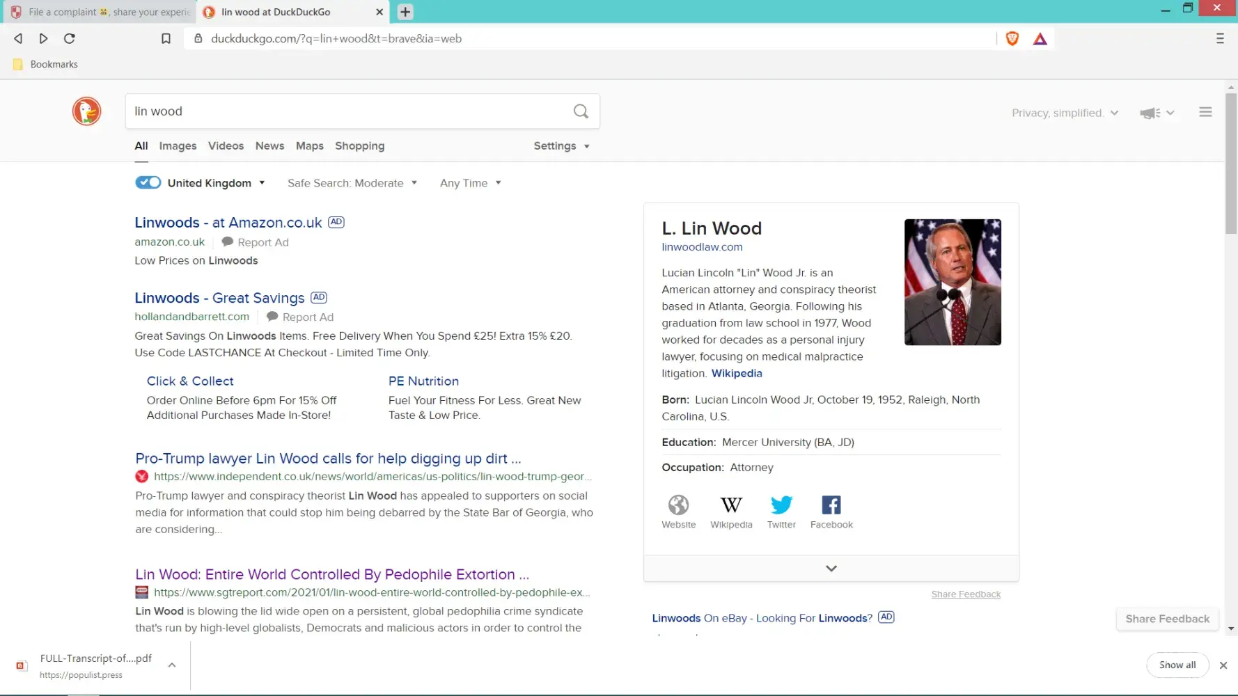 I have no personl involvement, am British and do not live in the USA but checked up on a lead to an interview done and decided to check to see if Lin Wood mentioned and Lin Wood who was involved with the US election fraud investigations were one and the same.