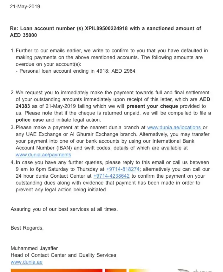 In a very timely approach, my Visa renewal was denied and when I called Dunia, they confirmed that they filed the Case in Khalifa Police Station(Abu Dhabi). They asked me to pay 15, 000 upfront and security check and monthly settlement of 2000 to be paid for the next 24 months. My loan was only 47k and 2500 CC and was able to pay them for 9mos straight.
