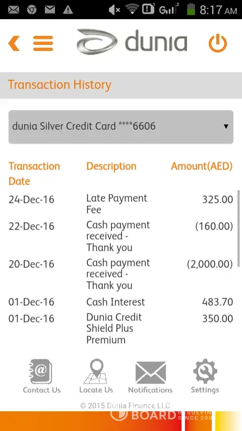 In my 20 years of stay, only Dunia ruined my experienced here in Dubai! High interest+ over charges for a card that i paid the balance in full amount but still getting bills! Take note the card is inactive for 8 years! They should be out of uae they are giving nightmares to residents!